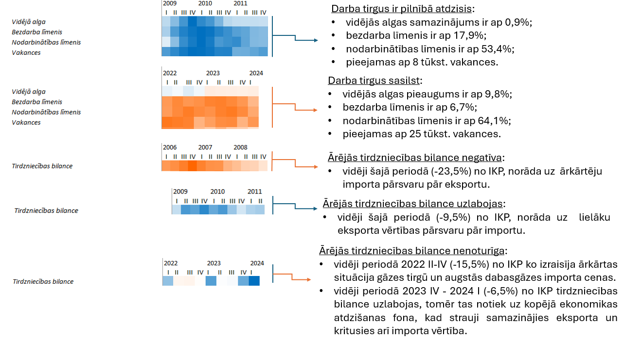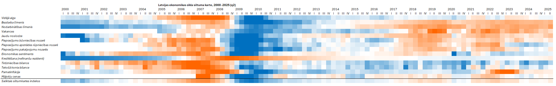 2025. gada otrajā ceturksnī saliktais ekonomikas siltuma kartes indekss uzlabojās līdz 0,3%, liecinot par pozitīviem pavērsieniem tautsaimniecībā, lai gan tos vēl nevar raksturot kā visaptverošus. Darba samaksas pieaugums ir stabils, pieaug arī nodarbinātība un jaudu noslodze, arvien mazāk uzņēmumu norāda uz pieprasījuma trūkumu, uzlabojas arī ekonomikas sentimenta rādītāji. Būtiski pozitīvi pavērsieni jūtami arī kreditēšanā gan mājsaimniecībām, gan uzņēmumiem. Ārējās tirdzniecības rādītājos vērojama mērena eksporta izaugsme, taču tirdzniecības bilance pasliktinājās pieaugušā importa apjoma dēļ; pieauga arī tekošā konta deficīts. Pamatinflācija Latvijā bija virs 3% un joprojām pārsniedza eirozonas vidējo līmeni.